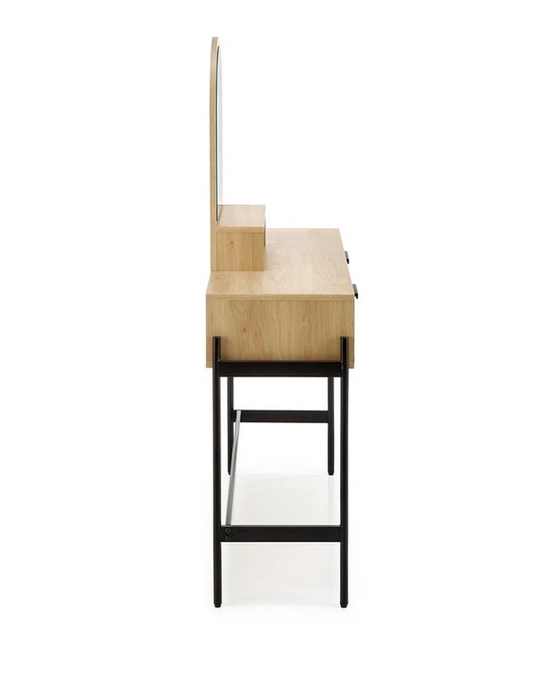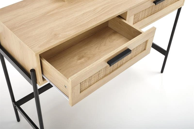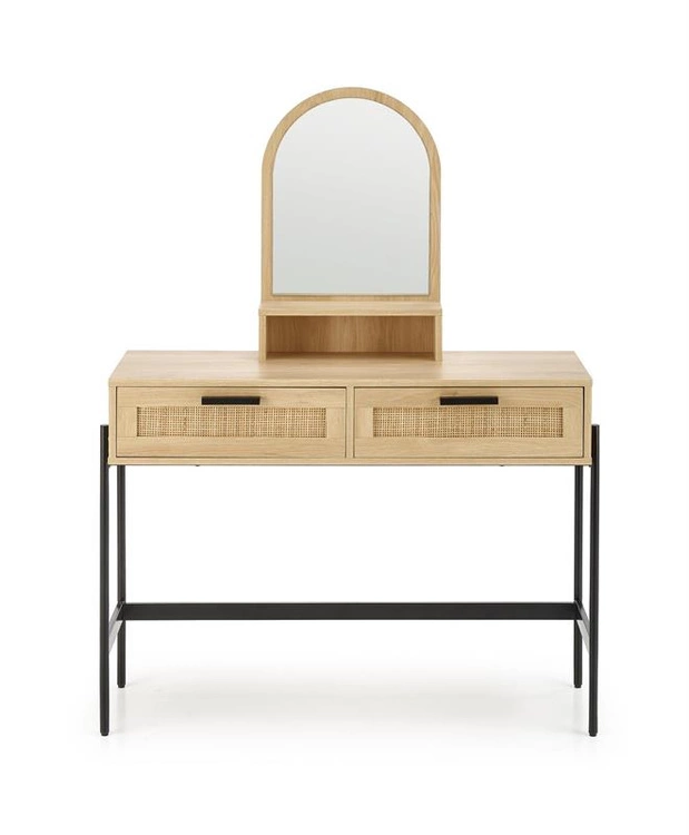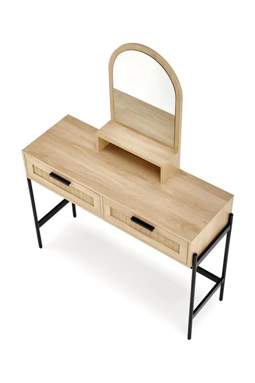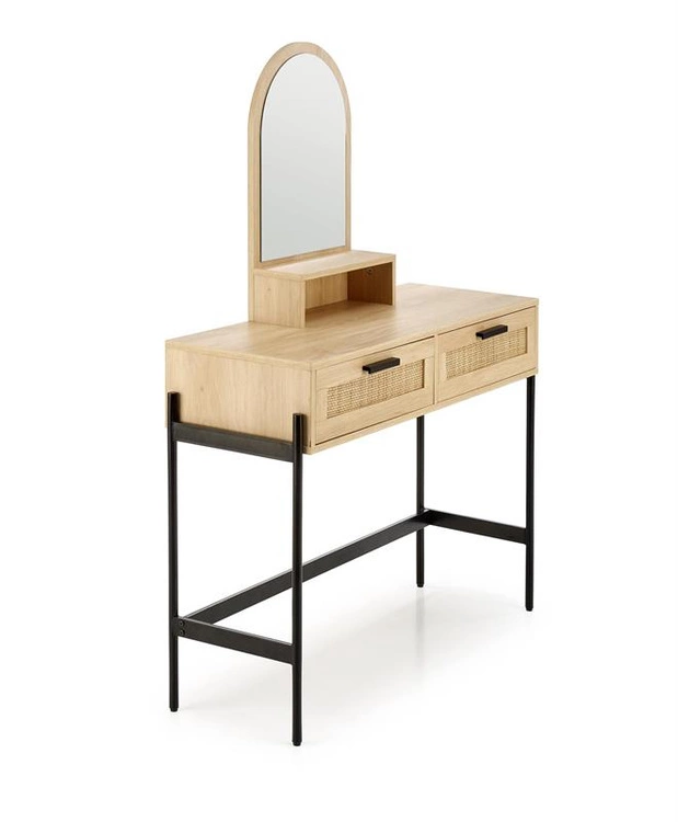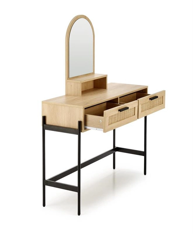 CARMEN Konsolka to elegancki mebel, który łączy klasykę z nowoczesnym designem. Wykonana z wysokiej jakości materiałów, takich jak lustro, płyta meblowa okleinowana melaminą, naturalny rattan oraz stal malowana proszkowo, konsolka wyróżnia się trwałością oraz estetyką. Jej naturalny kolor zestawiony z czarnymi akcentami nadaje jej wyjątkowy charakter, który pasuje do różnych stylów wnętrz. Konsolka CARMEN to doskonała opcja do przedpokoju, salonu czy sypialni, gdzie może pełnić rolę zarówno funkcjonalnego mebla, jak i dekoracyjnego elementu. Dzięki swojej eleganckiej formie i solidnej konstrukcji, stanowi stylowy dodatek do nowoczesnych i klasycznych aranżacji wnętrz.