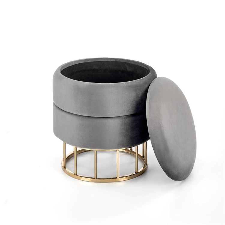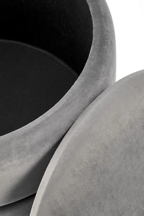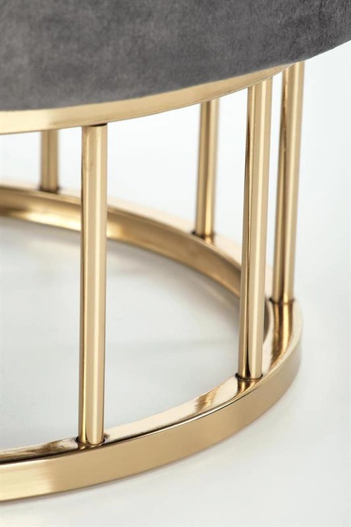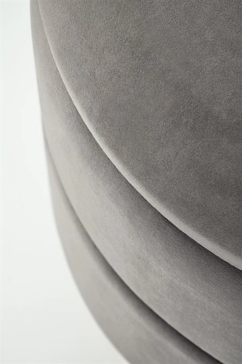 • Pufa MINTY w kolorze popielatym z eleganckimi złotymi akcentami. Wymiary: 37 cm średnicy i 41 cm wysokości. Wykonana z tkaniny i stali chromowanej, idealna do nowoczesnych wnętrz, jako praktyczny i stylowy dodatek.