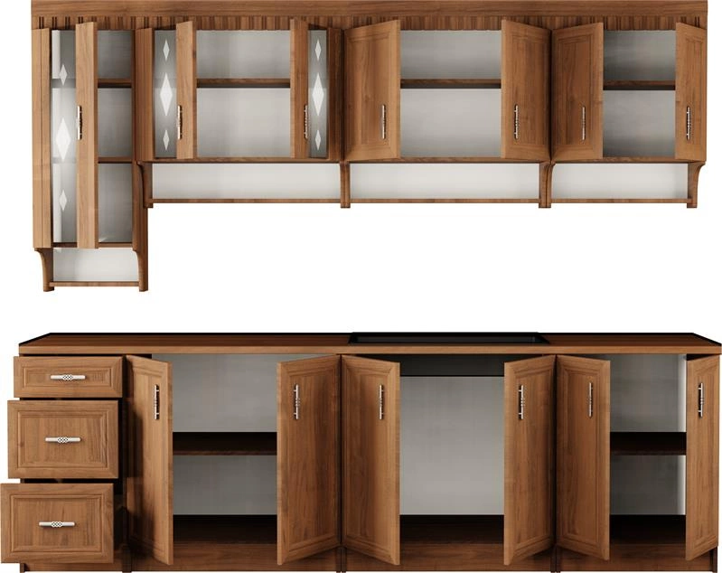 Kuchnia MARGARET 260 cm to doskonały wybór dla osób ceniących klasyczny design i naturalne akcenty w kuchni. Fronty wykonane z wysokiej jakości MDF w ciepłym kolorze orzecha stanowią główny element dekoracyjny, a korpus w tym samym odcieniu drewna tworzy spójną i elegancką całość. Blat o grubości 28 mm w kolorze orzech podkreśla naturalną estetykę zestawu, jednocześnie zapewniając funkcjonalność i trwałość.