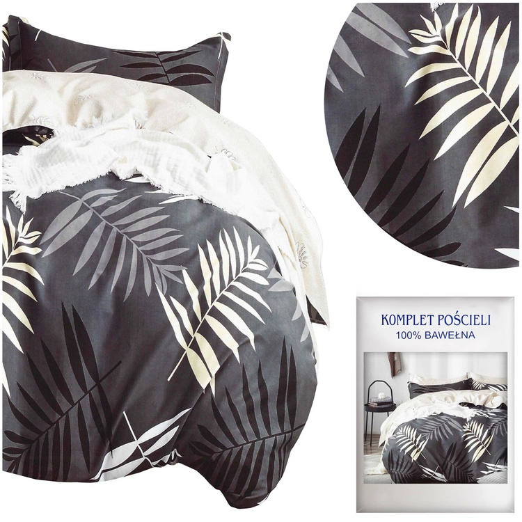 - Pościel Satyna Bawełniana nr A1297 o rozmiarze 160x200 cm w odcieniach czerni, z roślinnym wzorem. Zestaw 3 częściowy: poszwa na kołdrę oraz dwie poszewki na poduszki, zapewniająca elegancki i komfortowy sen.