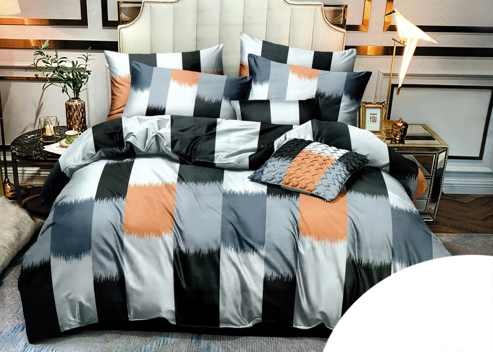 • Pościel Dalwin 879 w rozmiarze 200x220 cm z 3 częściami (poszwa 200x220 cm, 2 poszewki 70x80 cm). Wykonana z satyny bawełnianej o gramaturze 75 g/m², z zamkiem błyskawicznym. Kolor: odcienie szarości i srebra, bieli, pomarańczowego.