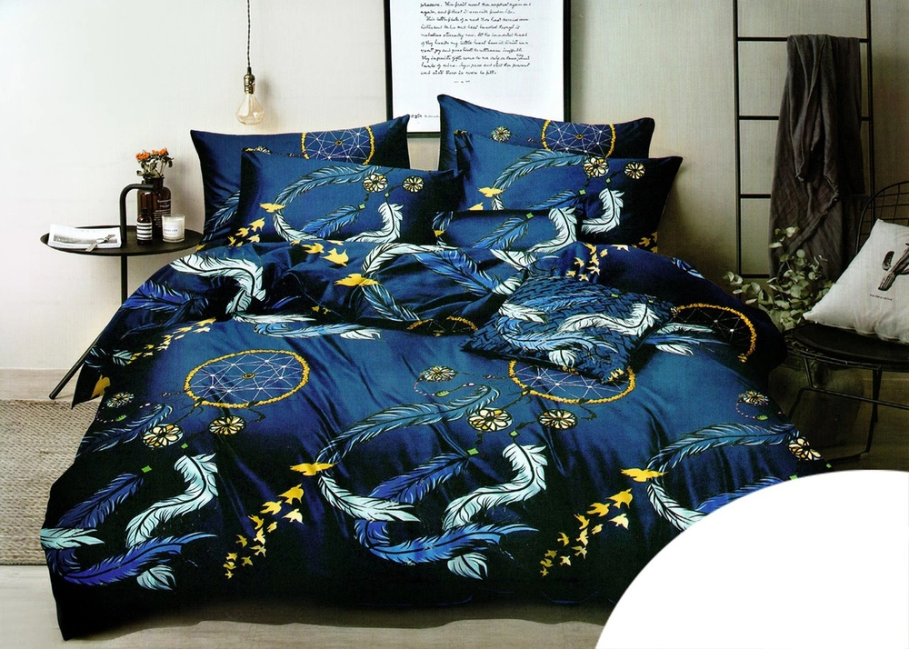 - Pościel Dalwin 866 w rozmiarze 160x200 cm (3 części: poszwa 160x200 cm, 2 poszewki 70x80 cm). Wykonana z satyny bawełnianej o gramaturze 75 g/m². Kolor: niebieski, żółty i złoty. Zamek błyskawiczny.