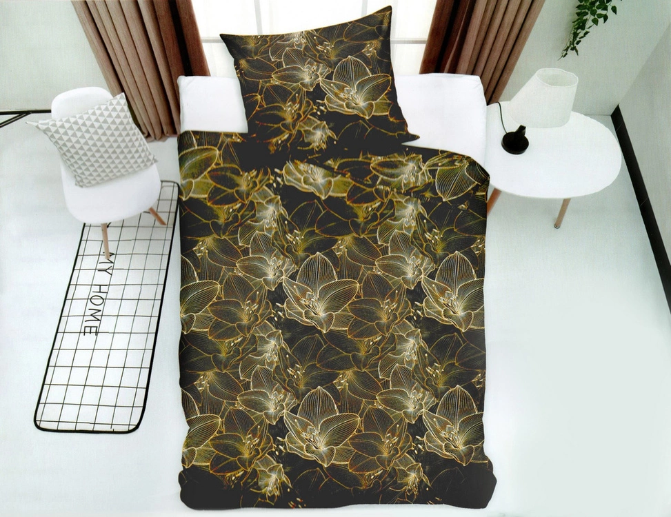 - Pościel 140 x 200 2cz Satynowa Dalwin 895 z satyny bawełnianej (75 g/m²) z zamkiem błyskawicznym. Zestaw składa się z poszwy (140x200 cm) i 2 poszewek (70x80 cm). Kolor: odcienie czarnego, żółtego i złotego.