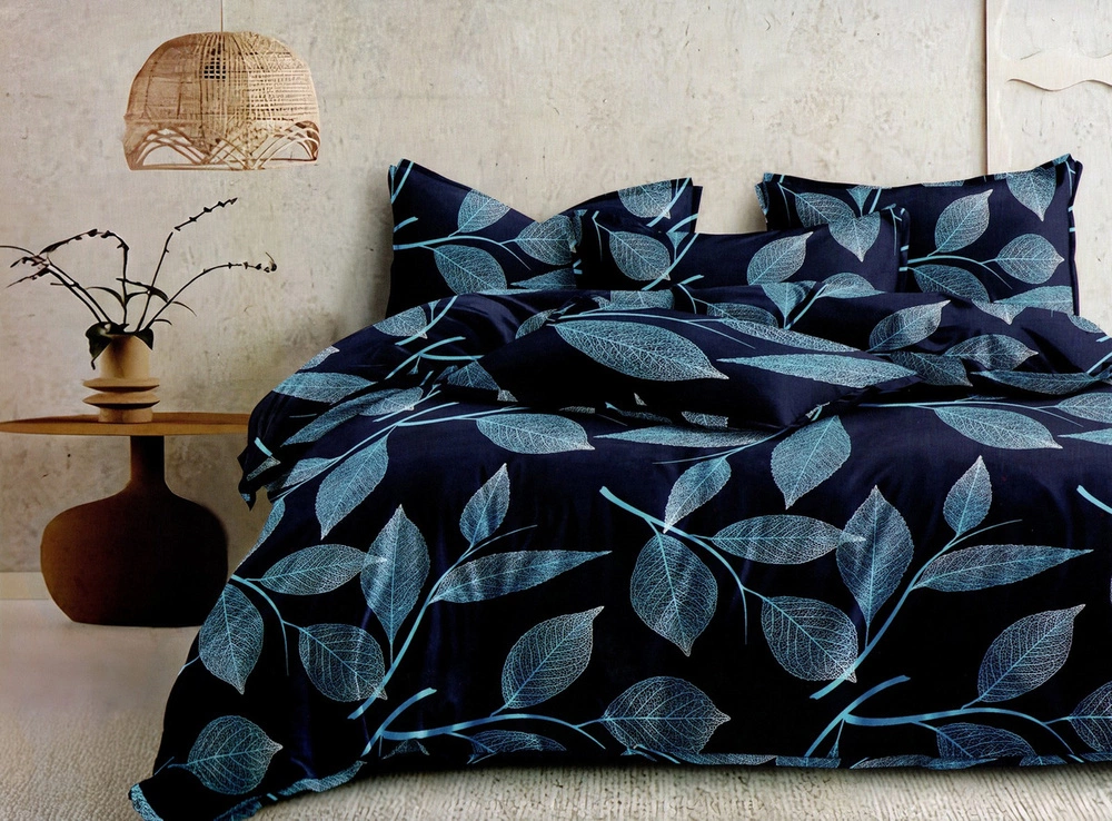 Pościel Dalwin 956 o wymiarach 200x220 cm wykonana z satyny bawełnianej w odcieniach niebieskiego. Zamek błyskawiczny zapewnia łatwość użytkowania. Zestaw składa się z poszwy, dwóch poszewek oraz tradycyjnego prześcieradła bez gumki.