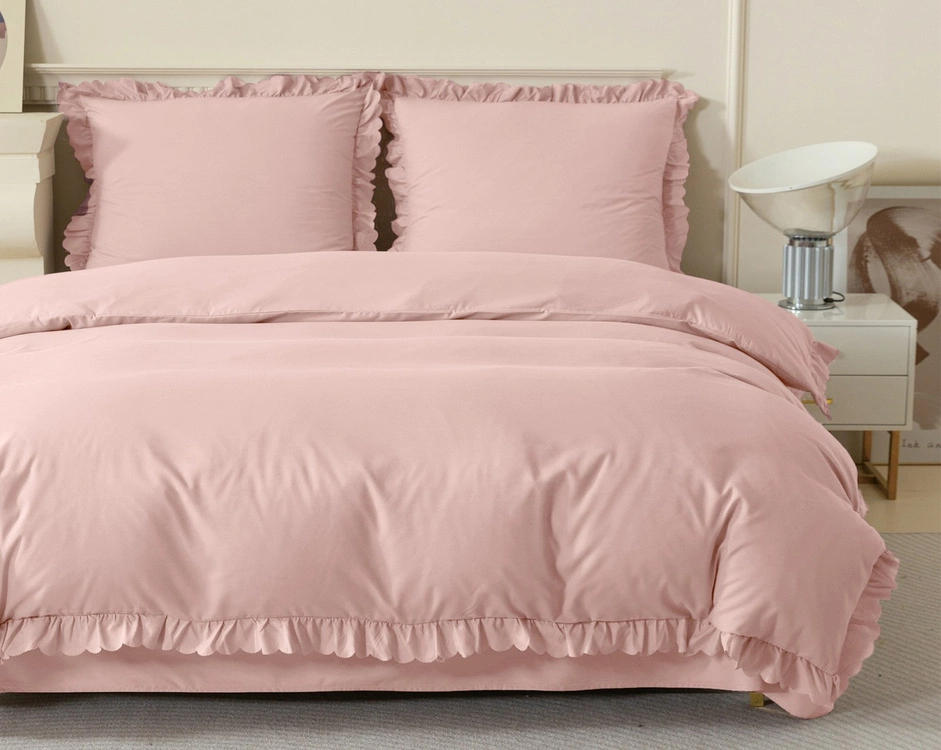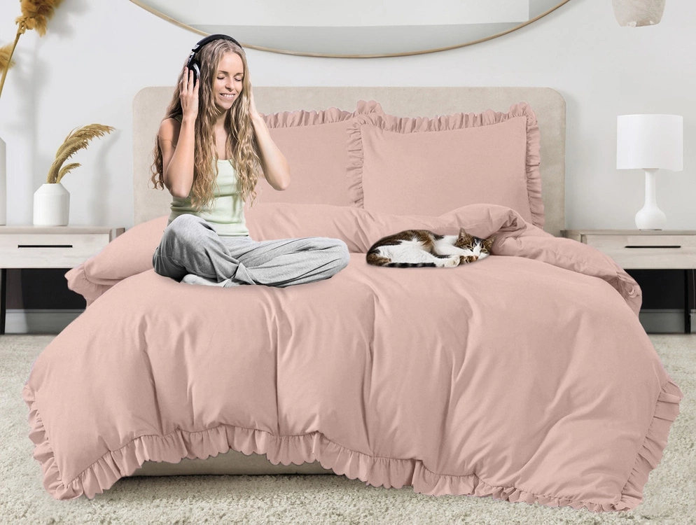 - Stylowa pościel Luxury Jowita 03 w odcieniach różu z falbaną, wykonana z miękkiej mikrofibry. Zestaw obejmuje poszwę 220x200 cm oraz 2 poszewki 70x80 cm.