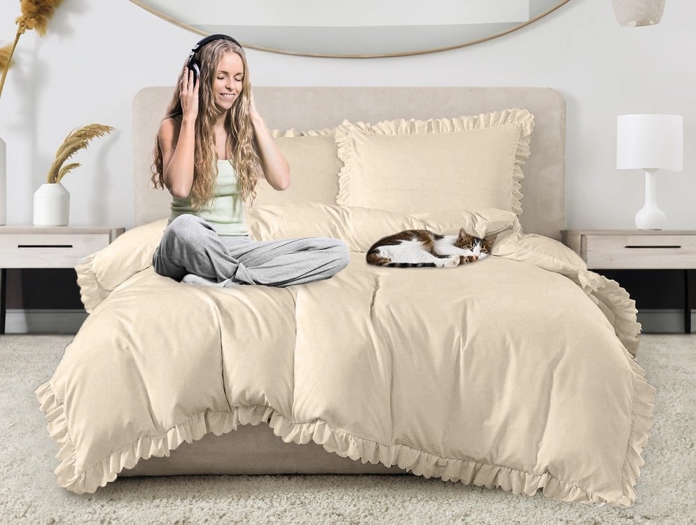 - Pościel Luxury Jowita 04 w odcieniach kremowego z falbaną to elegancka opcja do sypialni. Wykonana z mikrofibry, miękka i łatwa w pielęgnacji. Zamek błyskawiczny zapewnia komfort użytkowania. Komplet 4-częściowy, idealny do nowoczesnych wnętrz.