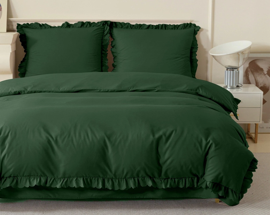 • Elegancka pościel Luxury Jowita 05 w odcieniach zieleni z dekoracyjną falbaną. Wykonana z delikatnej mikrofibry, zapewnia komfort snu i stylowy wygląd sypialni. Zestaw: poszwa 160x200 cm + 2 poszewki 70x80 cm.