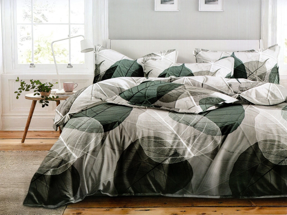 • Pościel Dalwin 982 w odcieniach zieleni oraz szarości i srebra. Satyna bawełniana, zestaw 3 części (poszwa 160x200 cm, 2 poszewki 70x80 cm). Zamek błyskawiczny ułatwia użytkowanie. Elegancka kolorystyka wprowadza subtelny, nowoczesny klimat.