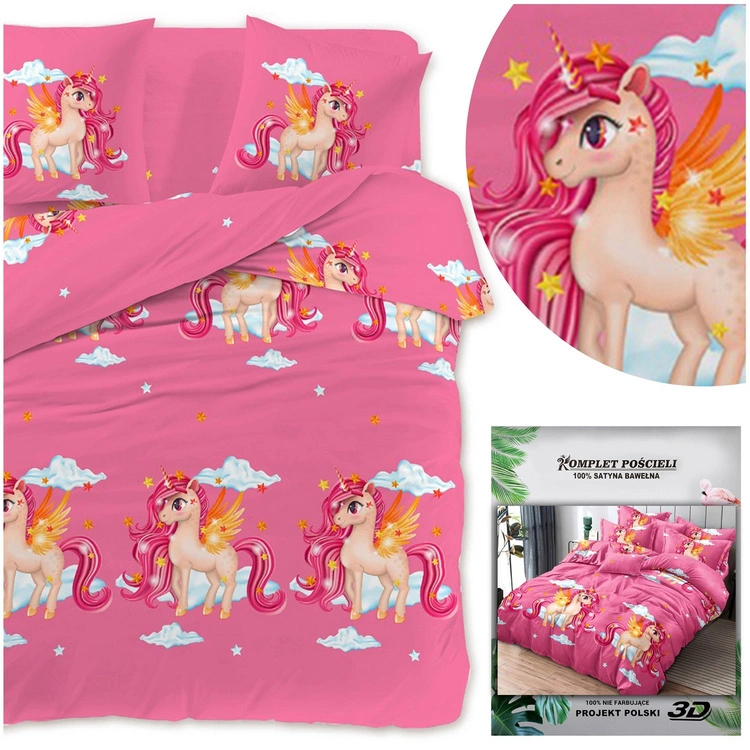 Pościel w różowe jednorożce 160 x 200 3cz Satynowa Maria 2509