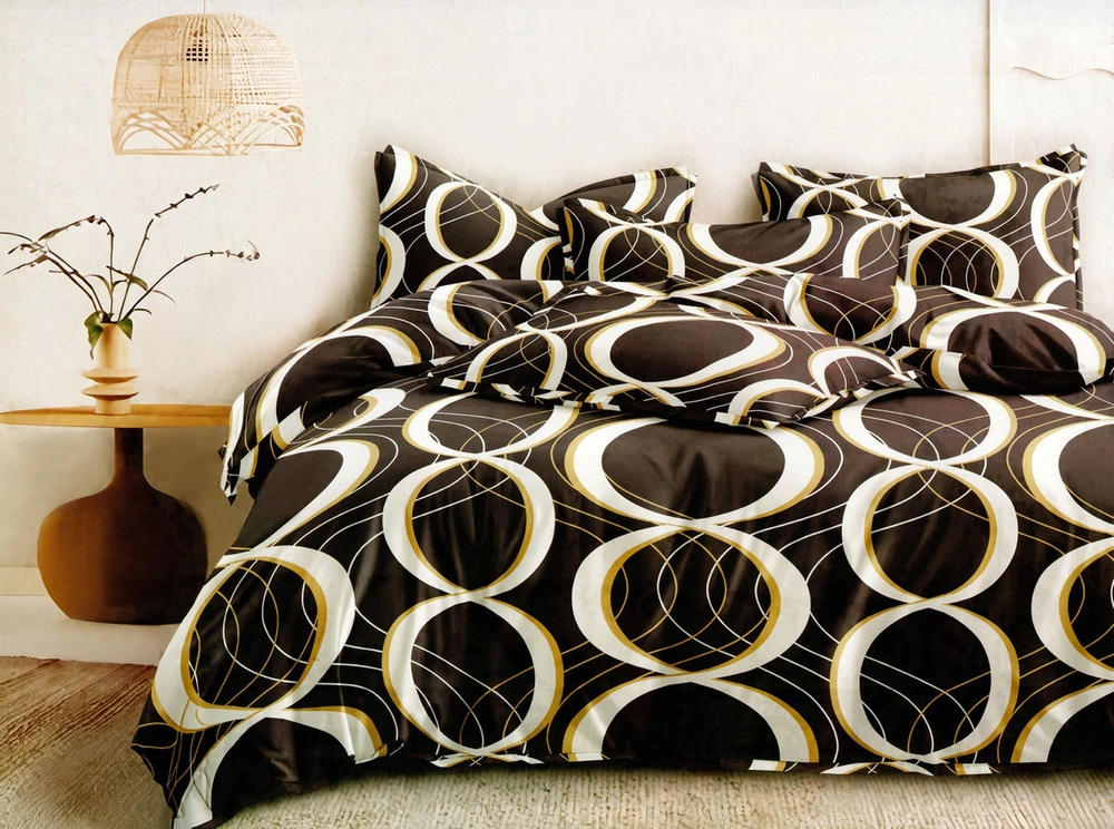 - Pościel Satynowa Dalwin 964, 4-częściowa, satyna bawełniana (75 g/m²). Poszwa 160x200 cm, 2 poszewki 70x80 cm, prześcieradło 180x230 cm. Zamek błyskawiczny, odcienie brązowego, żółtego i złotego. Komfort i elegancja w Twojej sypialni.