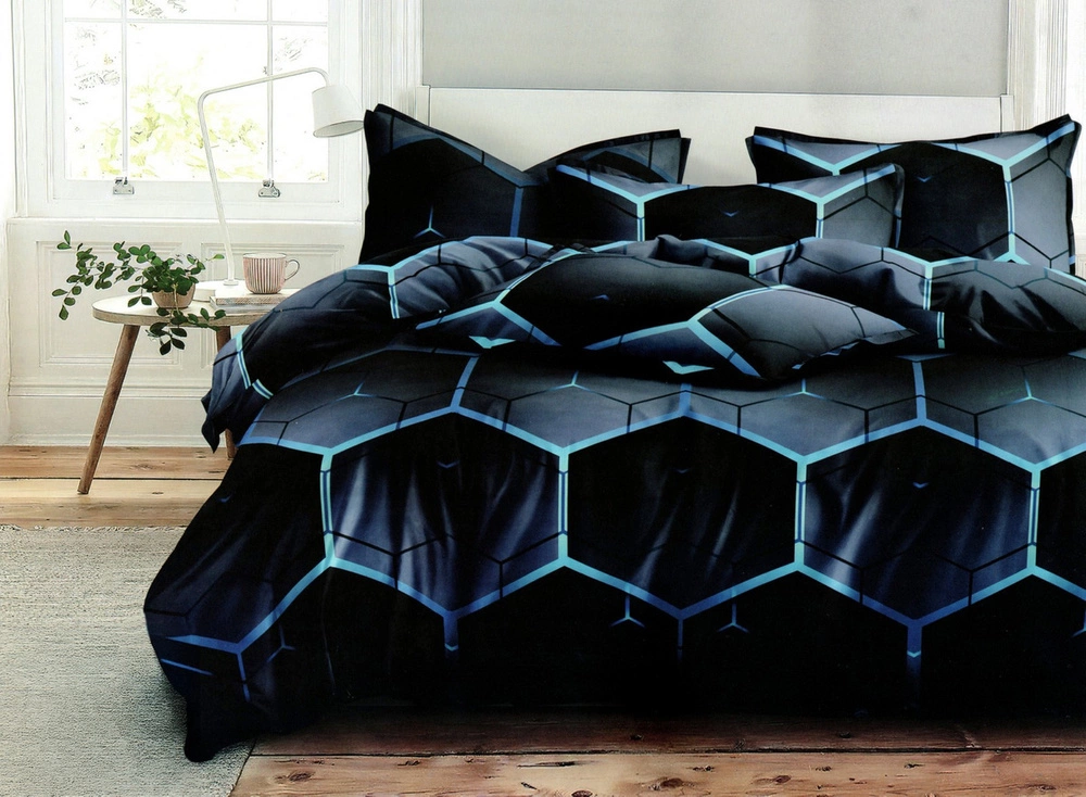 - Pościel 200x220 cm w odcieniach niebieskiego, wykonana z satyny bawełnianej o gramaturze 75 g/m². Zamek błyskawiczny. Zestaw 3 części.