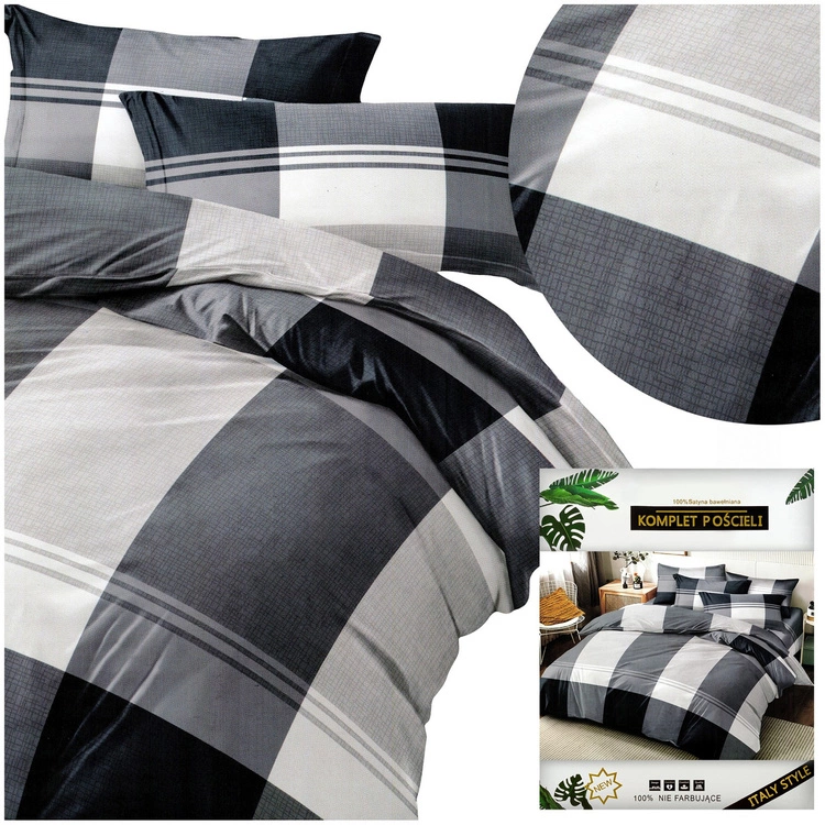 - Pościel 200x220 cm w odcieniach szarości i srebrnego, wykonana z satyny bawełnianej o gramaturze 75 g/m². Zamek błyskawiczny i trzy elementy w zestawie zapewniają wygodę oraz elegancki wygląd sypialni.