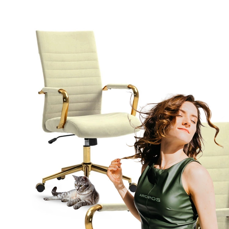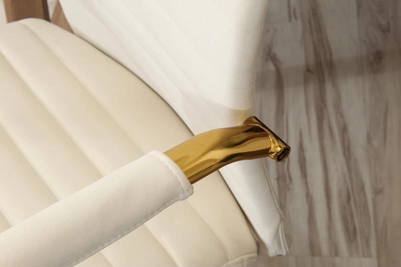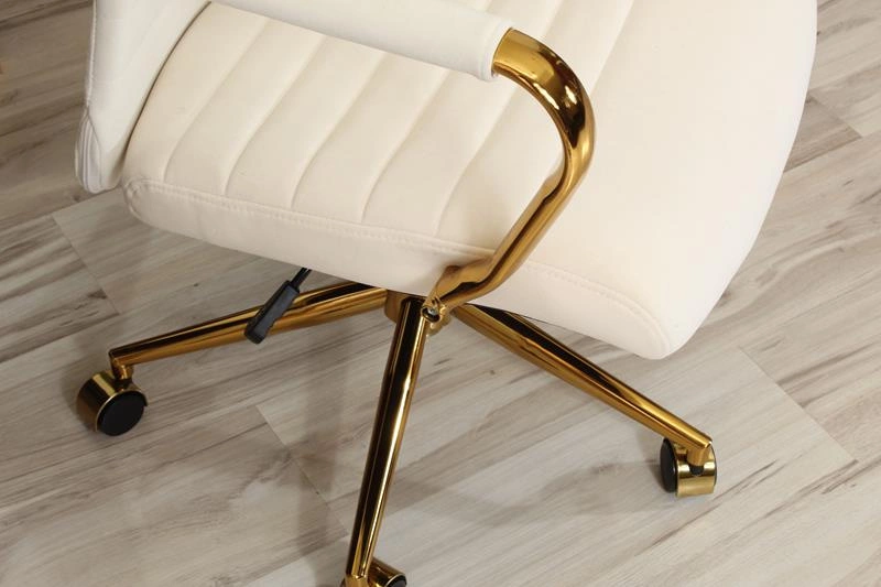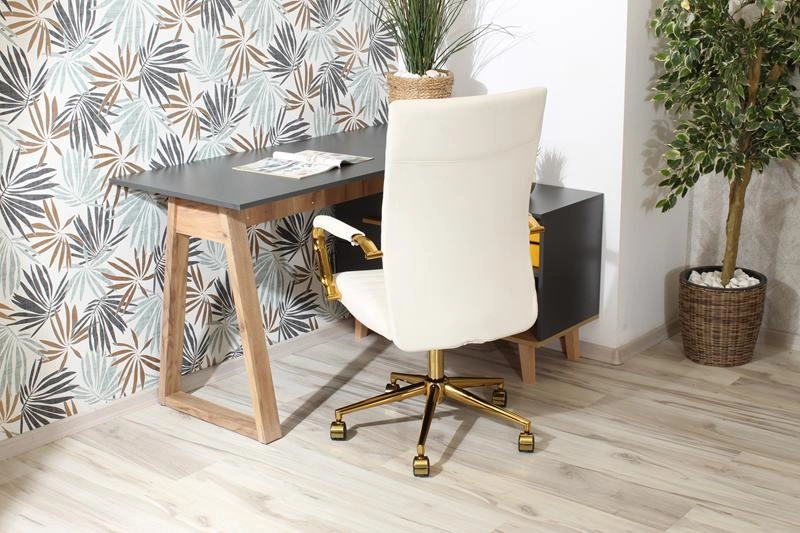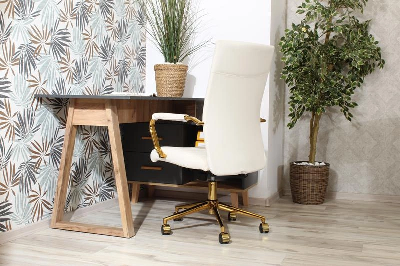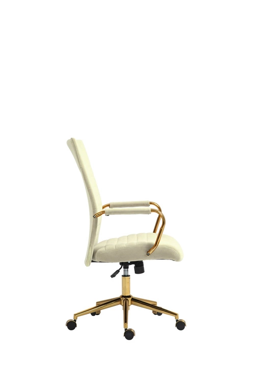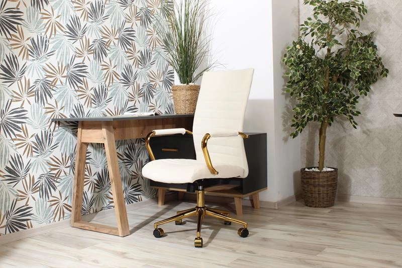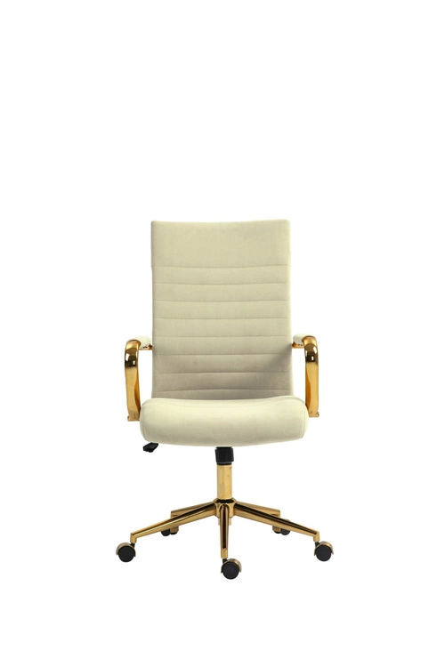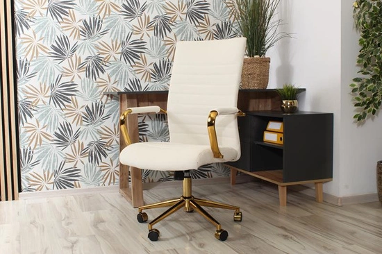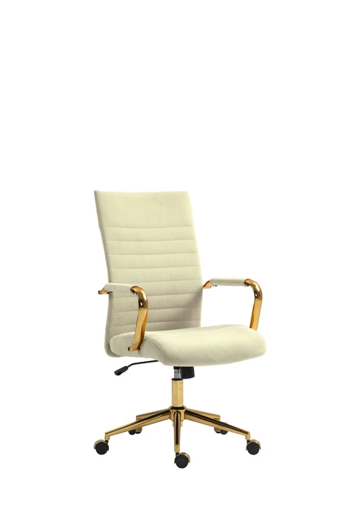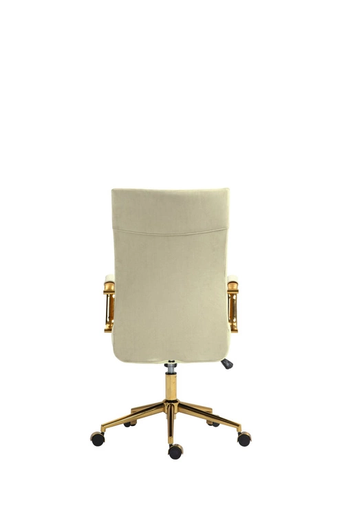 - Fotel biurowy DORIAN w kremowej tkaninie velvet na złotym stelażu. Posiada mechanizm TILT z regulacją wysokości oraz funkcją bujania. Stałe podłokietniki zapewniają wygodę, a elegancki design pasuje do nowoczesnych biur i gabinetów.