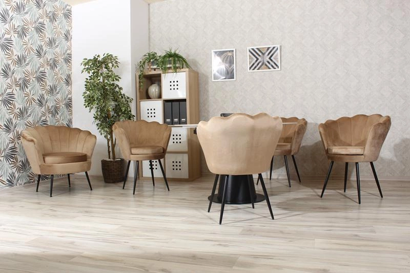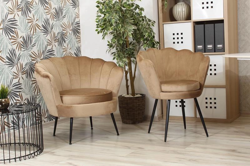 - Fotel muszelka VIDAL to styl i wygoda w jednym. Jego ciemnobeżowa welurowa tapicerka jest miękka i elegancka, a czarne metalowe nogi dodają mu nowoczesnego charakteru. Szerokie siedzisko i ergonomiczne oparcie zapewniają wyjątkowy komfort użytkowania.