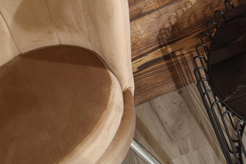Ciemnobeżowa tapicerka wykonana z wysokiej jakości velvetu dodaje fotelowi ekskluzywnego charakteru. Materiał ten jest wyjątkowo miękki i przyjemny w dotyku, a subtelny połysk podkreśla jego elegancki wygląd. Ozdobne pionowe przeszycia na oparciu dodają meblowi wyrafinowanego stylu i sprawiają, że staje się efektownym elementem każdej aranżacji.