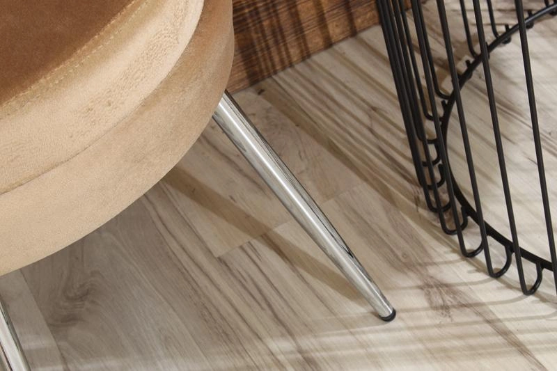 Srebrne, smukłe nogi wykonane z chromowanego metalu nadają fotelowi nowoczesnej lekkości, a jednocześnie zapewniają jego stabilność i trwałość. Dzięki kompaktowym wymiarom świetnie sprawdzi się w niewielkich pomieszczeniach, takich jak salon, sypialnia, garderoba czy elegancka przestrzeń biurowa.