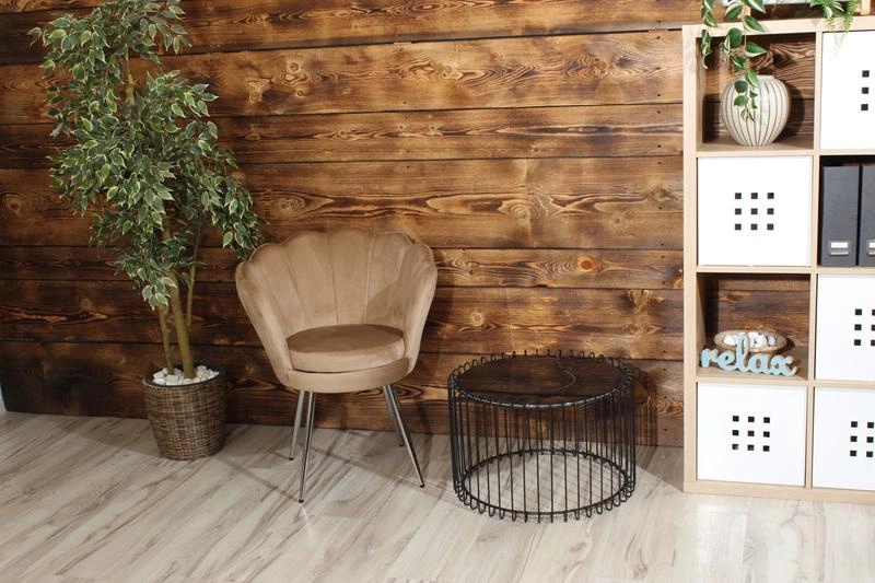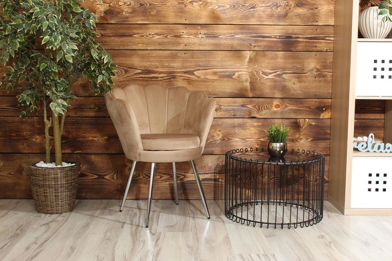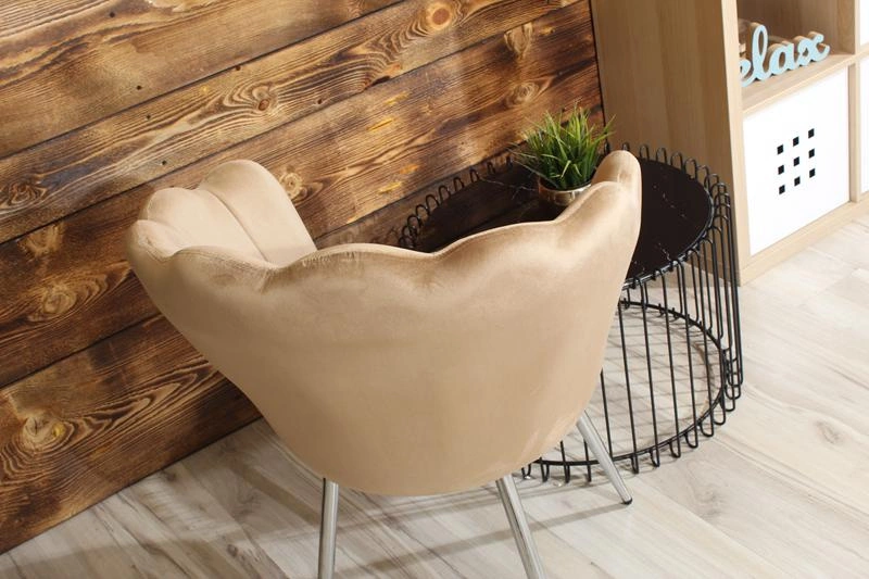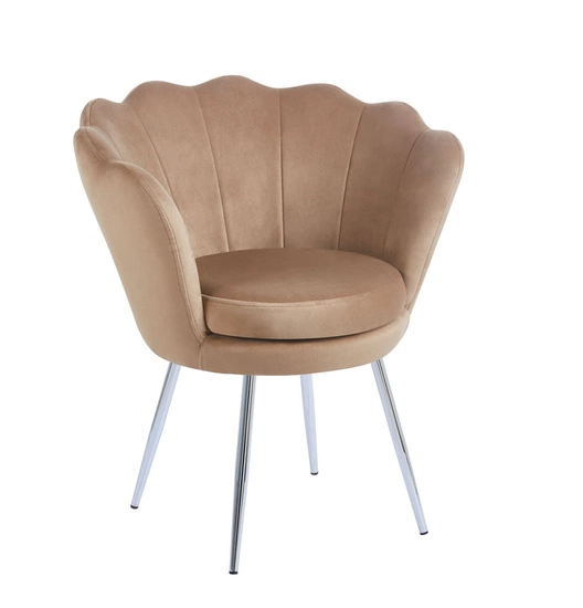 - Mały fotel muszelka SHELL to stylowe połączenie wygody i elegancji. Ciemnobeżowa welurowa tapicerka jest miękka i luksusowa, a srebrne nogi dodają mu nowoczesnego charakteru. Kompaktowy rozmiar i ergonomiczne oparcie sprawiają, że pasuje do każdej aranżac