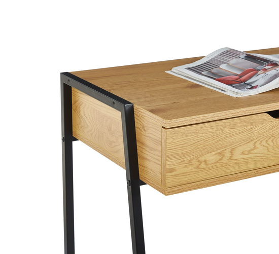 Biurko KARO łączy klasyczny design z nowoczesnymi rozwiązaniami. Wykonane z płyty wiórowej laminowanej w kolorze dąb naturalny oraz wyposażone w czarny metalowy stelaż, stanowi elegancki element każdego biura. Z dwoma szufladami, biurko oferuje funkcjonalną przestrzeń do przechowywania dokumentów i drobnych akcesoriów. Jego minimalistyczny wygląd doskonale wkomponuje się w różnorodne aranżacje wnętrz, a kompaktowe wymiary (szerokość 100 cm, głębokość 45 cm, wysokość 75 cm) sprawiają, że jest to doskonały wybór do mniejszych przestrzeni.
