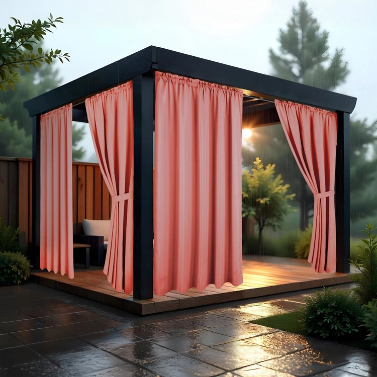 - Zasłona ogrodowa 155x200 cm wykonana z wodoodpornego poliestru, zawieszona na tunelu. Produkt marki Łóżkoholicy w odcieniach różowego, doskonale nadaje się do ochrony przed deszczem i wzbogaca przestrzeń zewnętrzną o subtelny, delikatny akcent kolorystycz