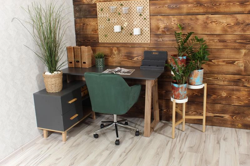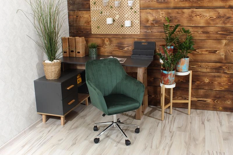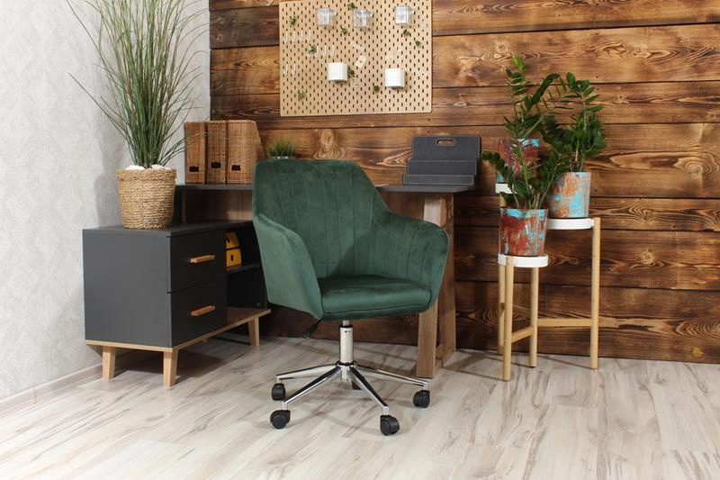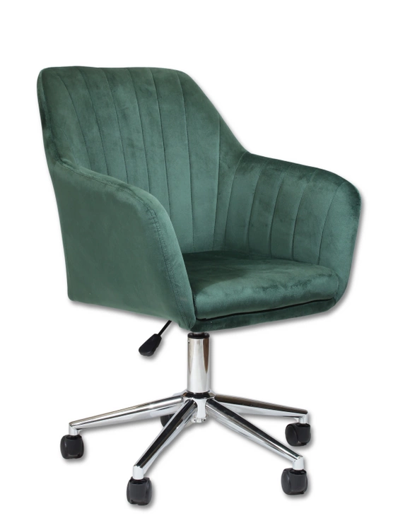 - Fotel obrotowy FABIO w eleganckim zielonym welurze i z połyskującą chromowaną podstawą to idealne połączenie stylu i wygody. Wyposażony w regulację wysokości i funkcję obrotu, sprawdzi się zarówno w domowym biurze, jak i przy toaletce.
