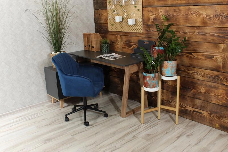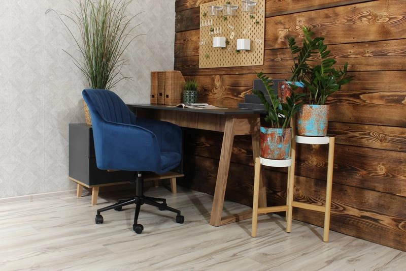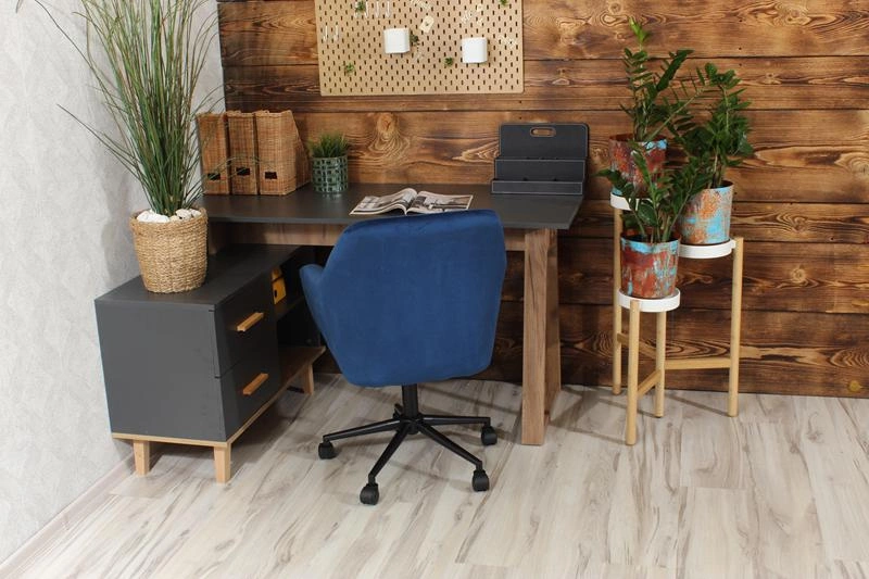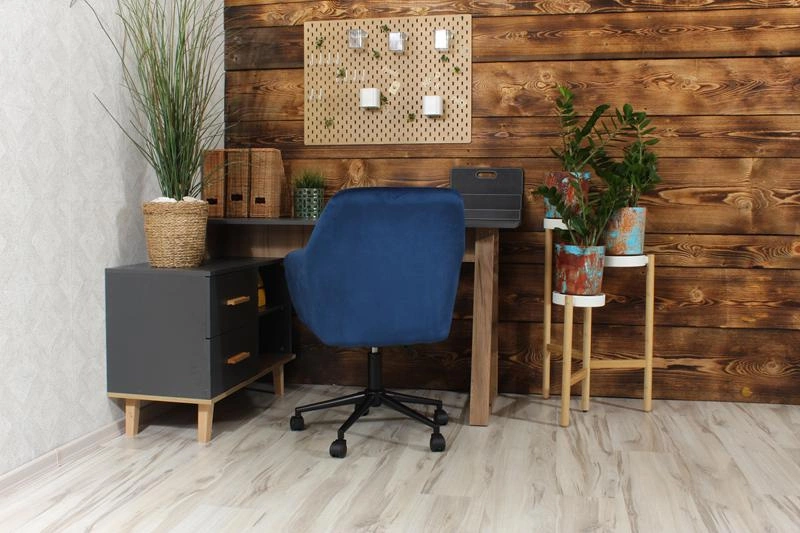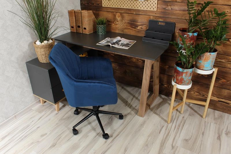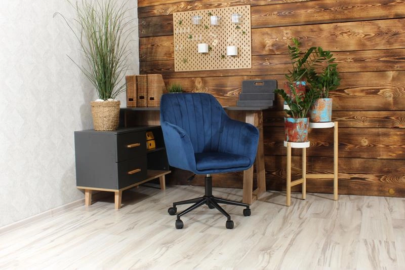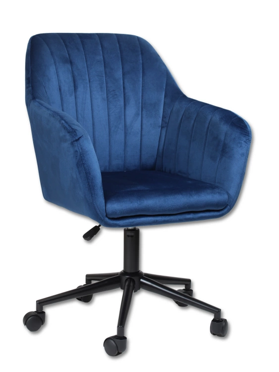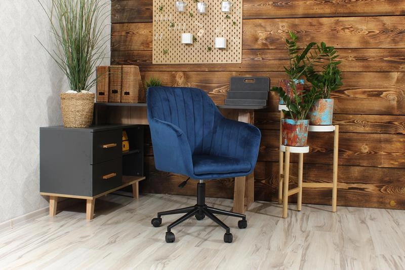 • Fotel obrotowy FABIO w głębokim granacie i z matową, czarną podstawą to elegancka i nowoczesna propozycja do domowego biura, toaletki lub salonu. Welurowe wykończenie dodaje mu szyku, a regulacja wysokości i obrót zapewniają wygodę użytkowania.