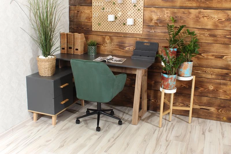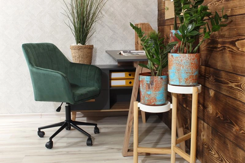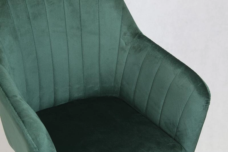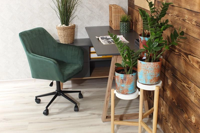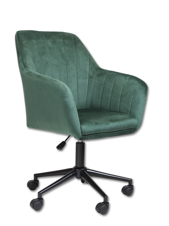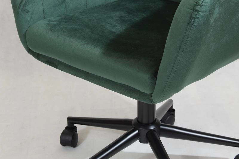 Fotel FABIO w kolorze głębokiej, soczystej zieleni z czarną podstawą to idealny wybór do nowoczesnych biur i designerskich przestrzeni. Aksamitna tapicerka dodaje wnętrzu klasy, a połączenie zielonego koloru z czarną stalową podstawą tworzy efektowny kontrast, który przyciąga wzrok. Został wyposażony w regulację wysokości, co pozwala na dopasowanie go do indywidualnych potrzeb użytkownika, oraz funkcję 360° obrotu, dzięki czemu zapewnia komfort użytkowania w każdej sytuacji. FABIO to fotel, który łączy elegancję z funkcjonalnością – idealny do pracy, odpoczynku czy jako akcent dekoracyjny w salonie, gabinecie czy sypialni.
