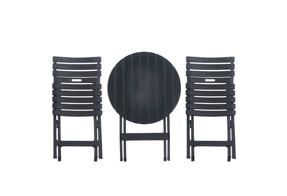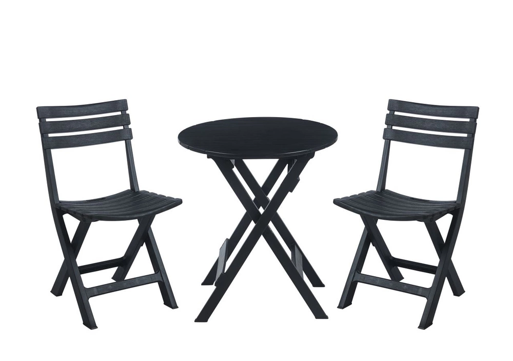 - Składany zestaw balkonowy NELLO: stolik + 2 krzesła w kolorze czarnym. Wykonany z tworzywa PP, odporny na promieniowanie UV. Idealny na balkon, taras czy ogród. Lekki, praktyczny i łatwy do przechowywania.