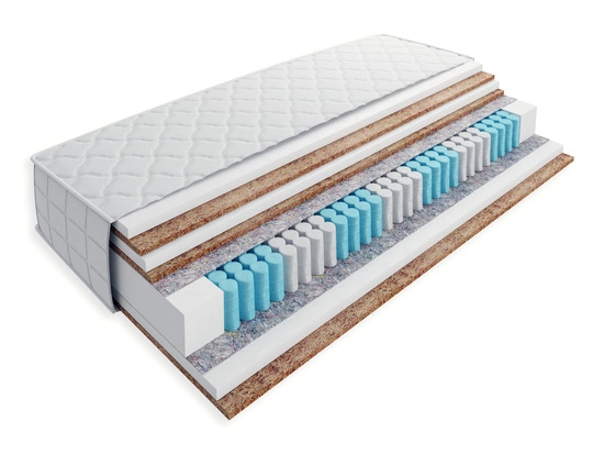 Wkład materaca tworzą aż trzy warstwy naturalnej maty kokosowej, przeplatane pianką T30 o podwyższonej gęstości. Taka konstrukcja zwiększa trwałość i zapobiega zapadaniu się. Wewnątrz zastosowano 7-strefowe sprężyny pocket, które indywidualnie dopasowują się do ciała i nie przenoszą drgań – to świetne rozwiązanie dla par.