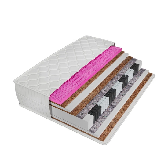 Górną warstwę komfortową tworzy pianka moletowana T28 o grubości 2–4 cm, której specjalnie profilowana powierzchnia poprawia cyrkulację powietrza, zwiększa komfort snu i działa mikromasująco. Bezpośrednio pod nią zastosowano dwie warstwy mat kokosowych oraz piankę T30, co zapewnia dużą odporność na odkształcenia, przewiewność i naturalną sztywność.