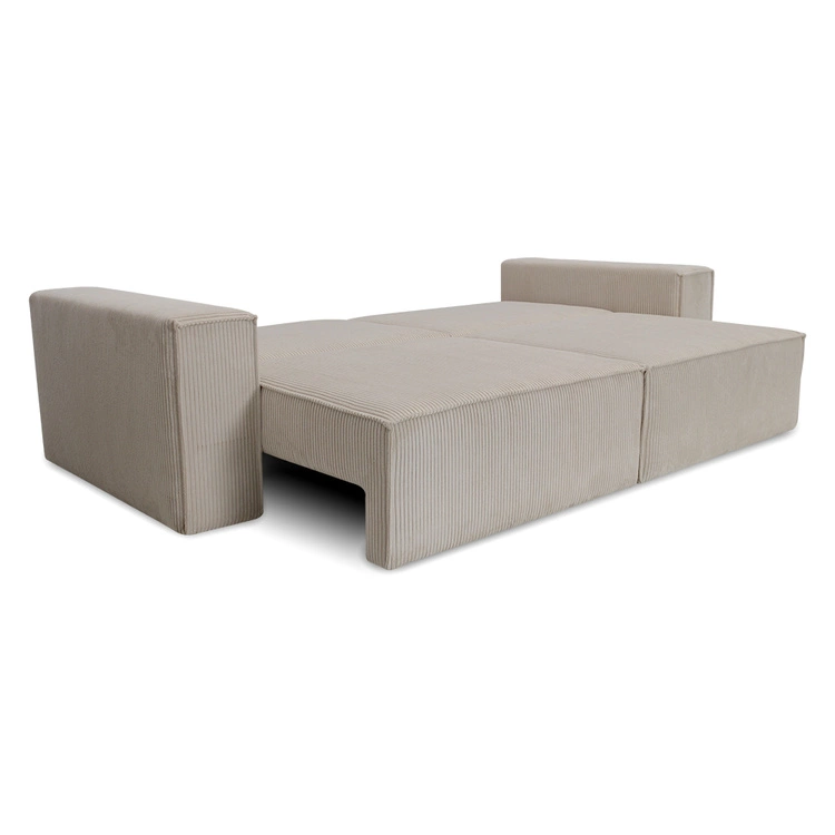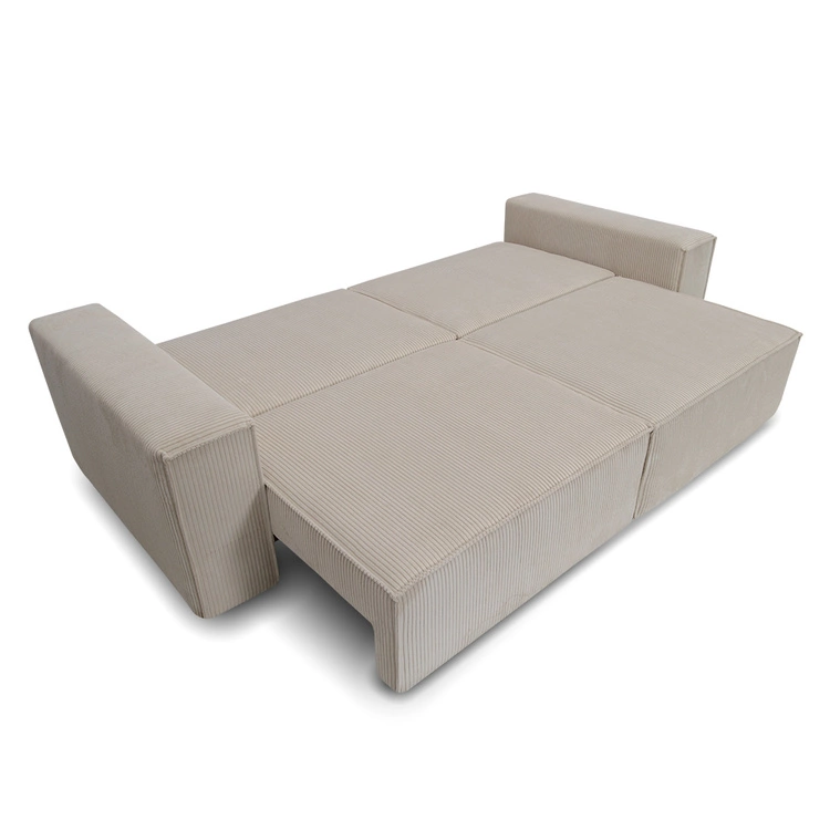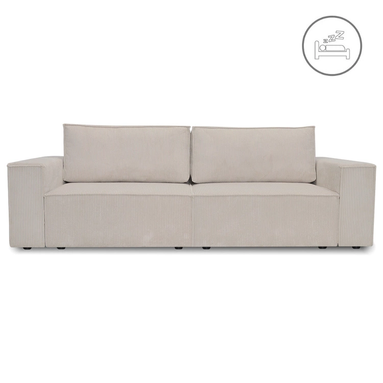 Szerokie podłokietniki, miękkie poduszki oraz ergonomiczne oparcie zapewniają wygodę podczas siedzenia. Łatwy w obsłudze mechanizm rozkładania umożliwia szybkie przekształcenie sofy w łóżko o powierzchni spania 150 × 190 cm. Dwa praktyczne pojemniki na pościel ułatwiają przechowywanie koców, poduszek i innych tekstyliów.