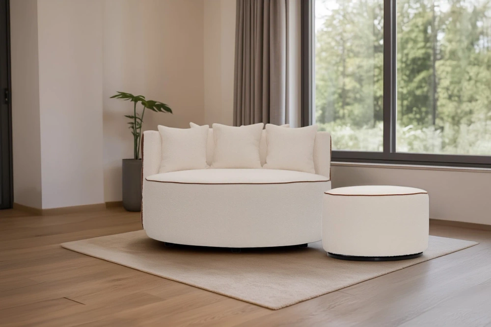 • Okrągła pufa LORIS to stylowy i komfortowy dodatek do wnętrza. Miękkie siedzisko, kompaktowa forma i możliwość wyboru wersji obrotowej sprawiają, że doskonale sprawdza się w salonie, sypialni czy przestrzeni komercyjnej.