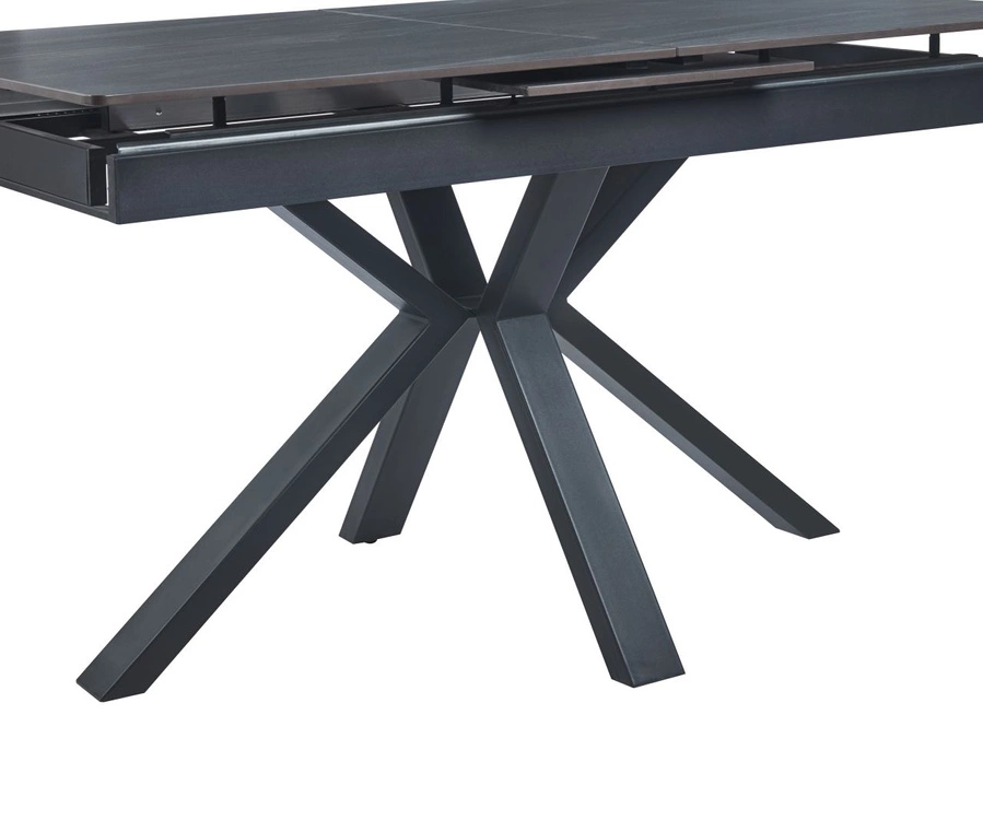 RAVO to wyjątkowy stół rozkładany, który łączy nowoczesny design z wysoką funkcjonalnością. Dzięki mechanizmowi synchronicznemu z automatycznym wysuwem wkładki, rozkładanie blatu jest szybkie i wygodne – bez konieczności wyciągania dodatkowych elementów z osobnych schowków. Blat oraz wkładka wykonane zostały z ceramiki – materiału nie tylko eleganckiego, ale przede wszystkim odpornego na zarysowania, wysokie temperatury i codzienne użytkowanie. Matowe, szare wykończenie blatu nadaje całości subtelnej elegancji i uniwersalnego charakteru, który pasuje zarówno do wnętrz nowoczesnych, loftowych, jak i klasycznych. Solidna konstrukcja oparta jest na metalowych nogach i ramie malowanych proszkowo na czarno, co gwarantuje trwałość, stabilność oraz estetyczny wygląd. Po rozłożeniu długość stołu zwiększa się z 140 cm do 180 cm, co sprawia, że idealnie sprawdzi się podczas rodzinnych spotkań i większych przyjęć.