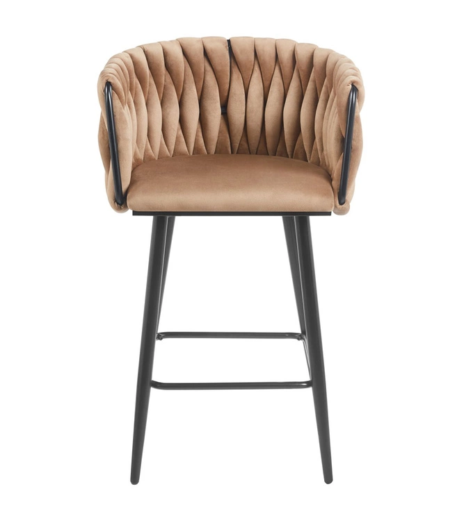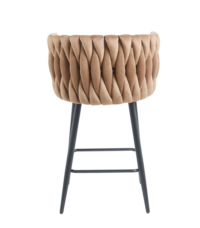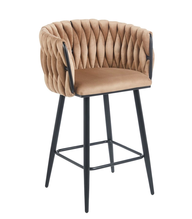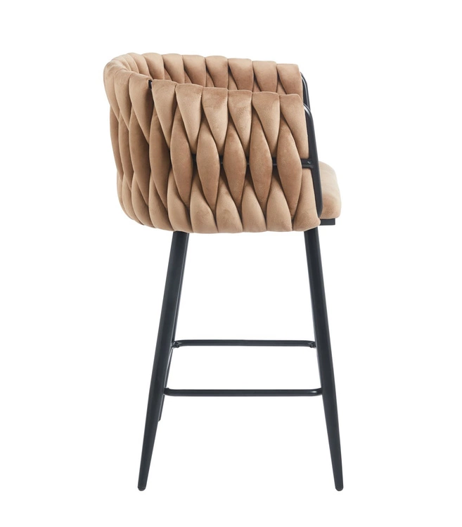 - Krzesło barowe ROSA 3 to elegancja w nowoczesnym wydaniu. Ciemnobeżowa welurowa tapicerka z dekoracyjną plecionką i czarny, metalowy stelaż tworzą zgrany duet, idealny do kuchni i jadalni w stylu glamour.