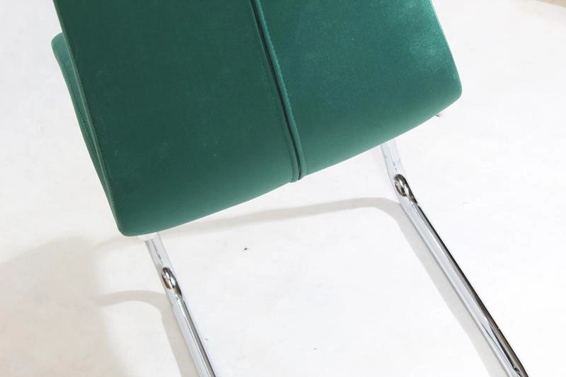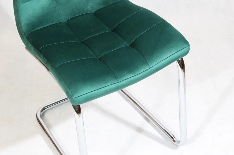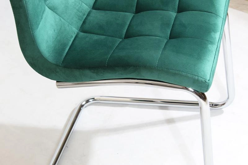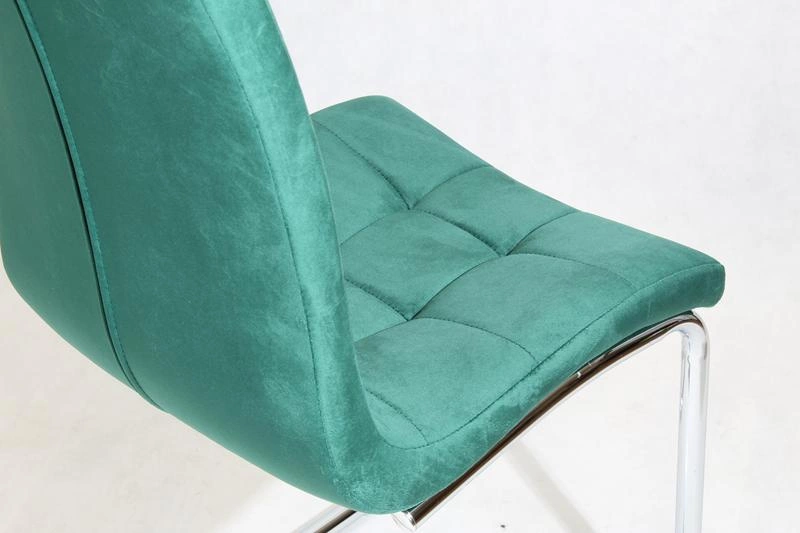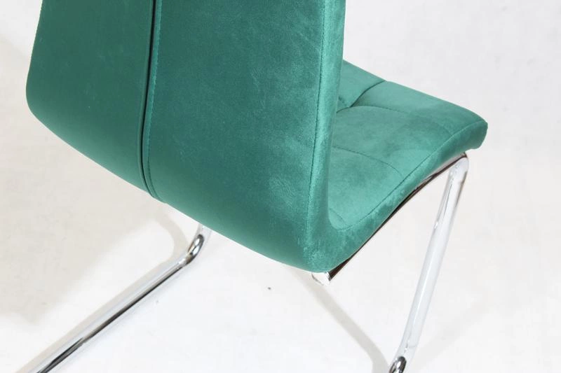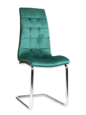 - Stylowe krzesło CORSO A w zielonym welurze na srebrnych płozach to połączenie elegancji i nowoczesności. Dekoracyjne przeszycia i smukła forma sprawiają, że idealnie pasuje do jadalni, salonu lub gabinetu.