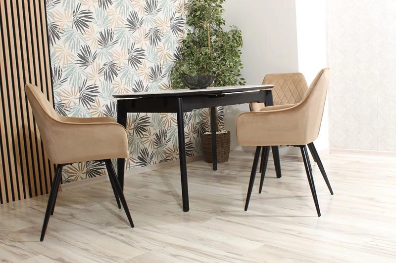 Krzesło CARBO to doskonały wybór dla miłośników eleganckiego minimalizmu. Jego ciemnobeżowa tapicerka w połączeniu z nowoczesnymi, czarnymi nogami tworzy subtelny, ale efektowny kontrast, który pasuje do wielu aranżacji wnętrz.