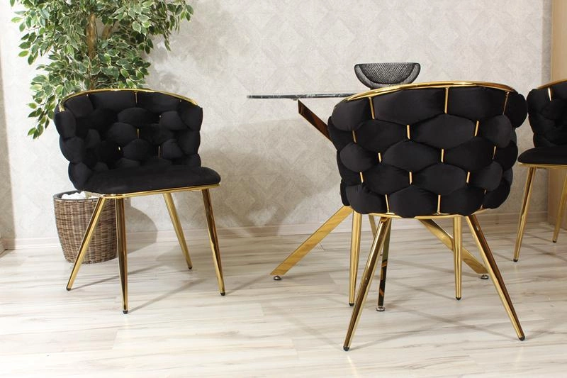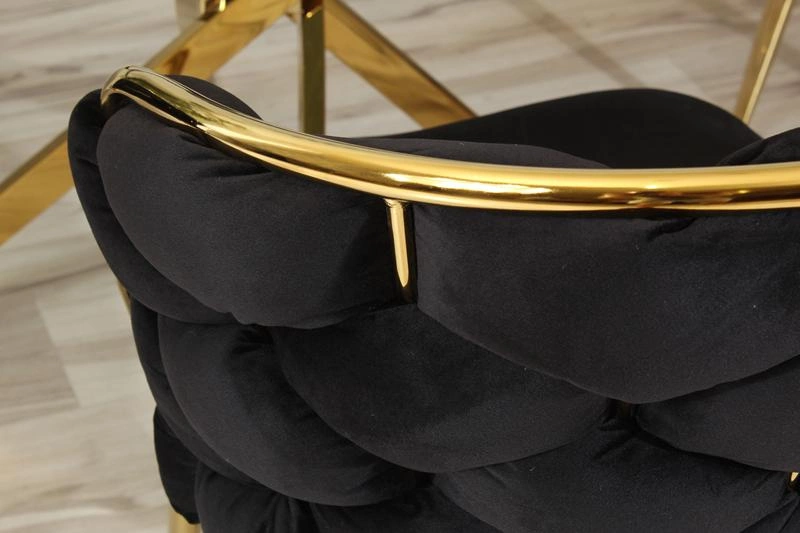 Eleganckie krzesło MIRELLA GOLD w czarnym kolorze to kwintesencja nowoczesnej elegancji i stylu glamour. Jego miękka, welurowa tapicerka w głębokim, czarnym odcieniu zachwyca nie tylko wyglądem, ale i komfortem użytkowania. Idealnie dopasowane proporcje oraz delikatnie zaokrąglone oparcie zapewniają wygodę nawet podczas dłuższego siedzenia.