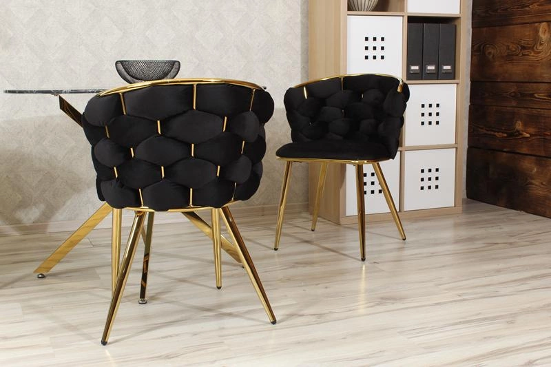 - Stylowe krzesło MIRELLA GOLD w czarnej tapicerce velvet i na złotym stelażu to połączenie elegancji, komfortu i nowoczesnego glamour. Idealne do jadalni, salonu czy gabinetu.