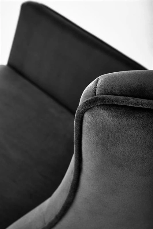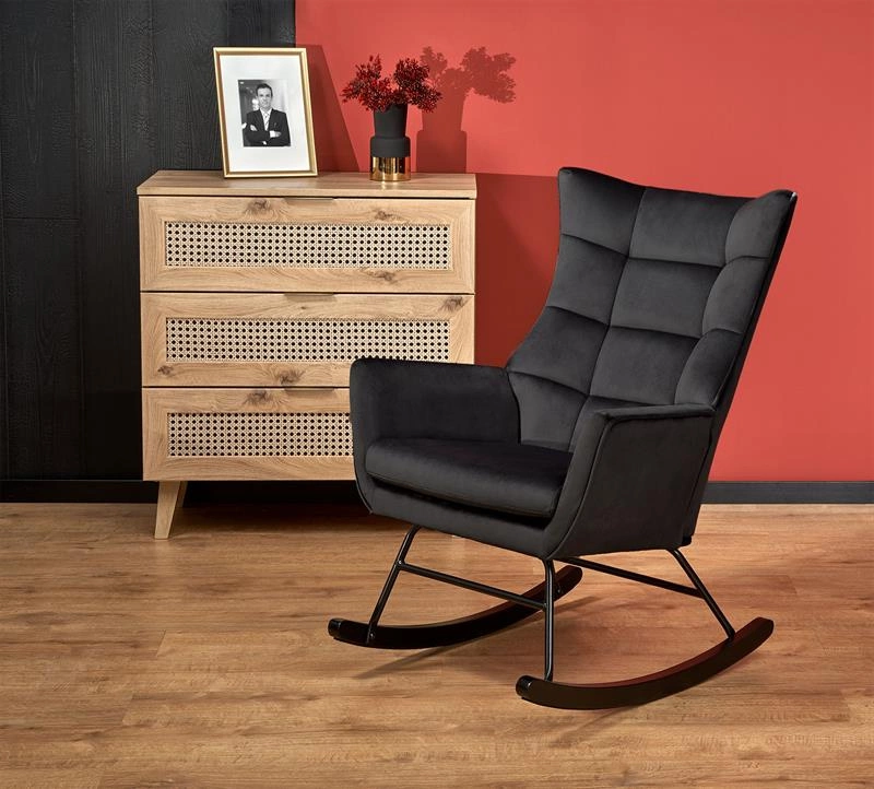 • Fotel bujany BAZALTO w czarnym kolorze łączy komfort welurowej tapicerki z nowoczesnym designem. Stabilna konstrukcja ze stali i drewna litego zapewnia trwałość, a bujane płozy wprowadzają relaks i styl do wnętrza.