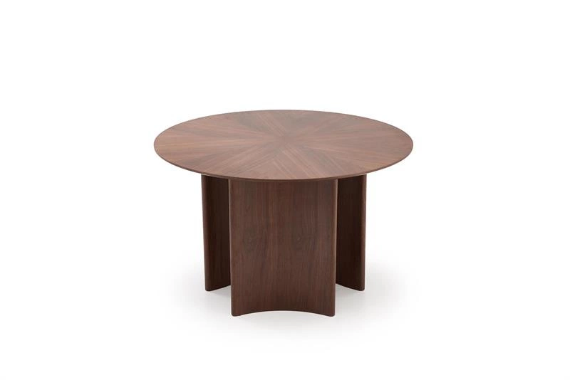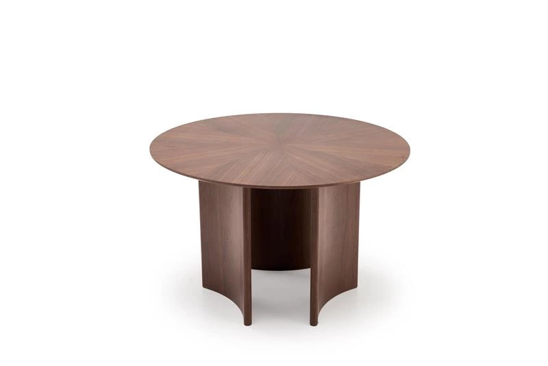 • Stół CALDO to elegancki, okrągły stół w kolorze orzechowym, wykonany z MDF z okleiną naturalną. Klasyczna forma i ciepły odcień drewna wprowadzają do wnętrza przytulność i ponadczasowy styl.