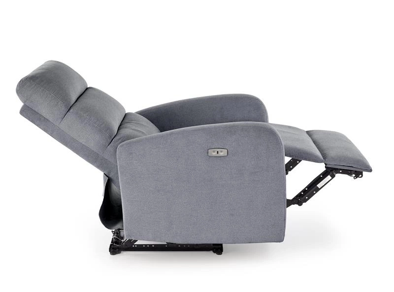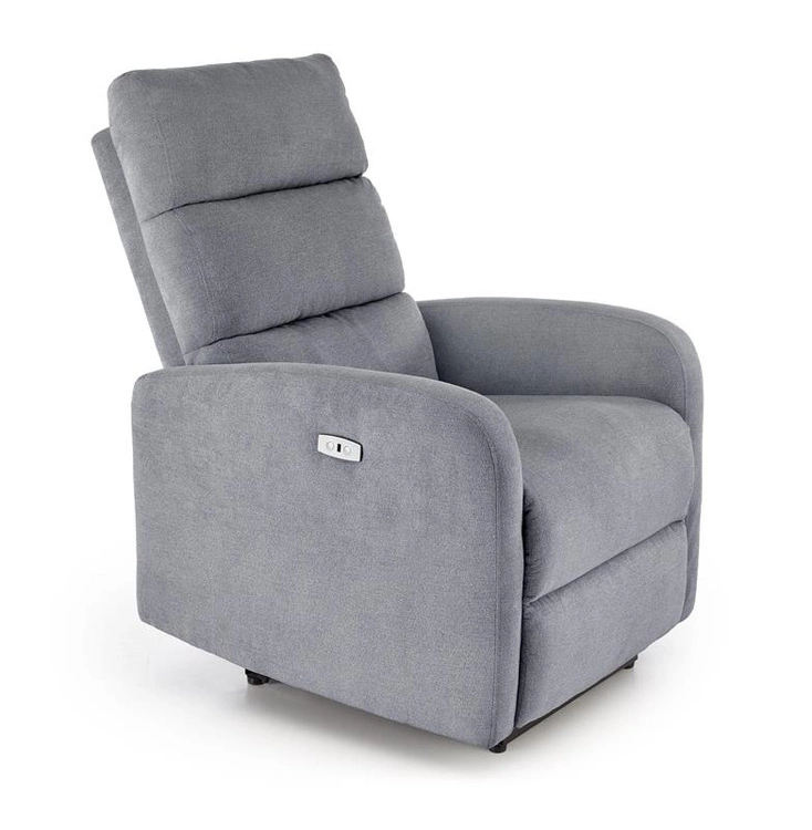 - Fotel CARINIO w kolorze popielatym łączy elegancję i funkcjonalność. Wyposażony w elektryczne rozkładanie i funkcję masażu, zapewnia wygodę oraz odprężenie, idealny do salonu lub domowej strefy relaksu.