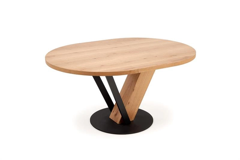 • Okrągły stół rozkładany FANIS to połączenie elegancji dębowego blatu z nowoczesnym charakterem czarnych stalowych nóg. Wykonany z MDF z okleiną dębową, rozkłada się do 160 cm, idealny do jadalni lub salonu.