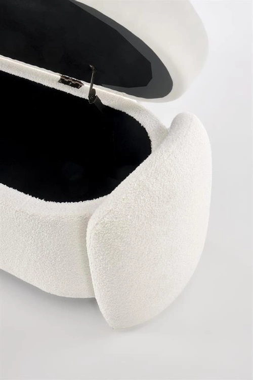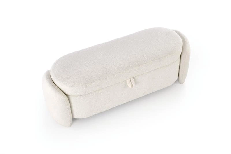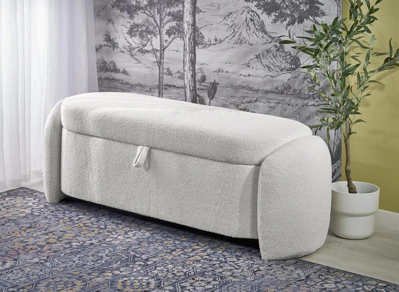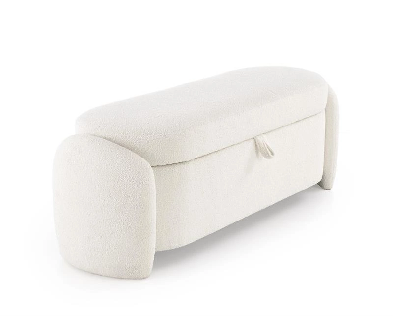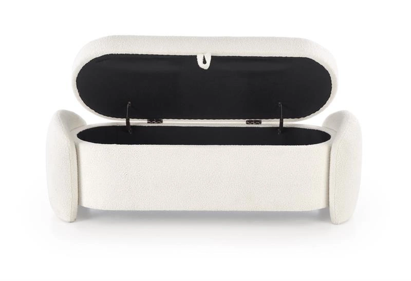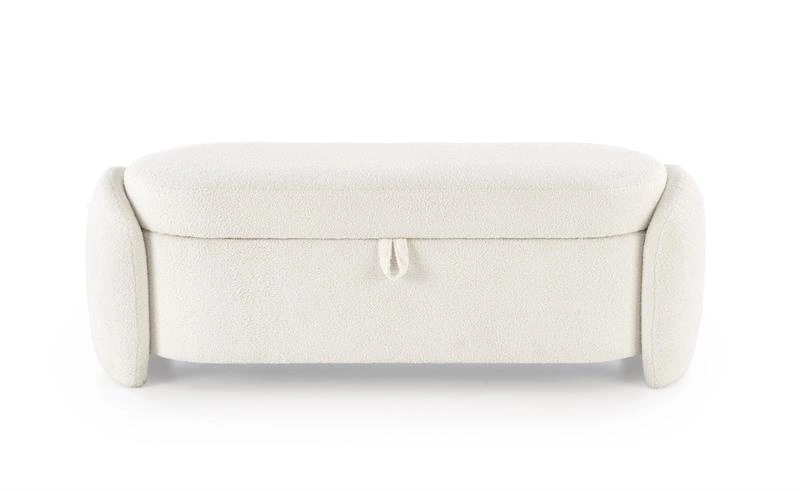 - Ławka FICARIA w kremowej tkaninie boucle łączy elegancję z praktycznością. Wyposażona w pojemnik, oferuje dodatkowe miejsce do przechowywania, a miękkie siedzisko zapewnia komfort użytkowania w salonie, sypialni lub przedpokoju.
