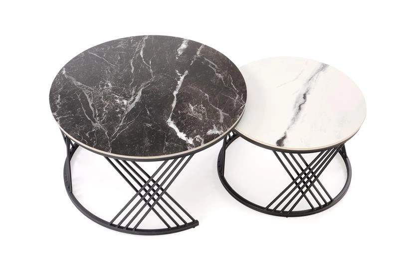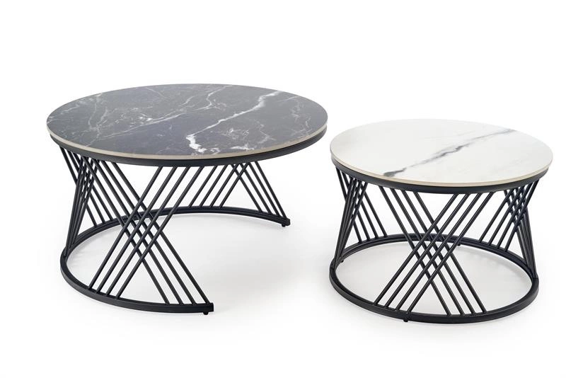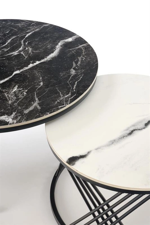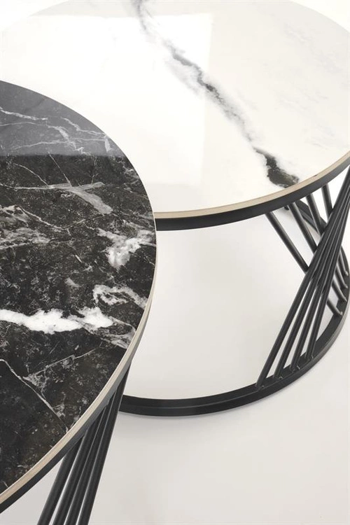 • Zestaw dwóch ław FLAMINGO łączy elegancję czarnego i białego marmuru z nowoczesną, czarną stalową podstawą. Wykonane ze spieku, są trwałe, odporne na zarysowania i stanowią stylową dekorację salonu w każdym wnętrzu.