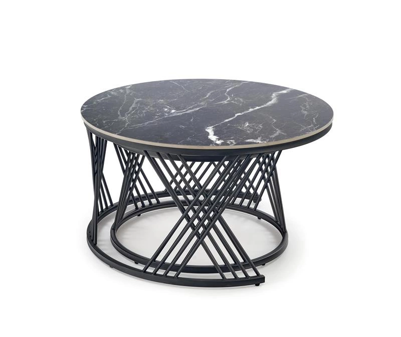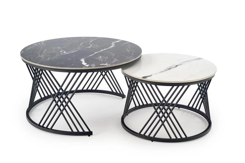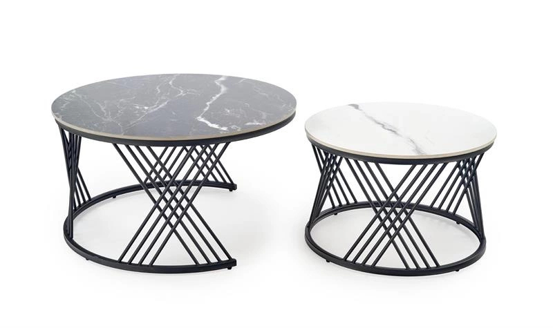 FLAMINGO to komplet dwóch ław, które wyróżniają się wyjątkowym połączeniem kolorów i materiałów. Większy stolik posiada blat z czarnego marmuru, a mniejszy z białego marmuru, oba wykonane z wytrzymałego spieku, który jest odporny na uszkodzenia, wilgoć i wysoką temperaturę. Podstawy ze stali malowanej proszkowo w czarnym kolorze nadają im nowoczesnego, loftowego charakteru oraz gwarantują stabilność. Różne wysokości blatów pozwalają ustawiać ławy razem lub osobno, tworząc funkcjonalną i efektowną przestrzeń. Ten zestaw doskonale sprawdzi się w salonach urządzonych w stylu nowoczesnym, glamour czy industrialnym.