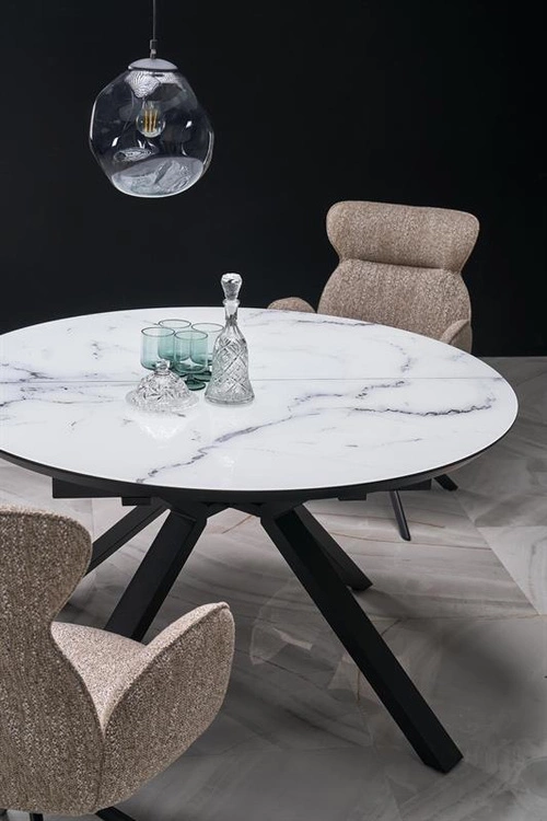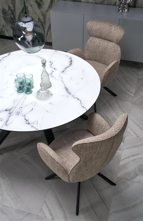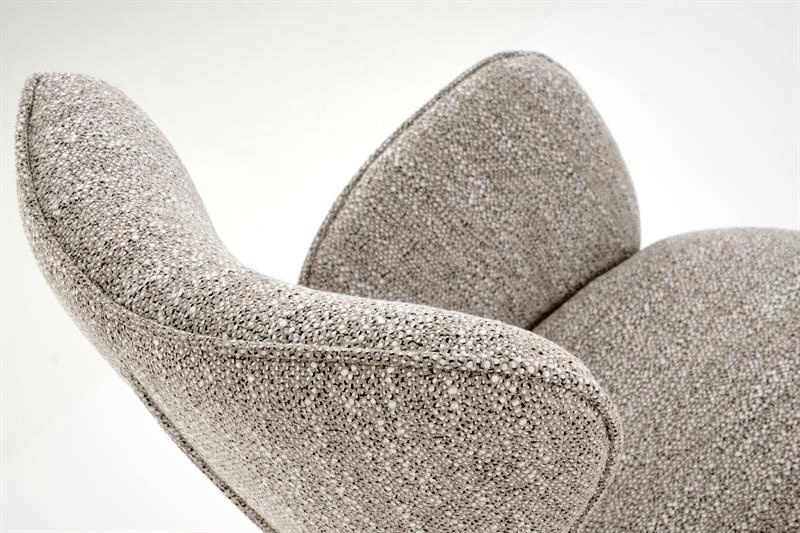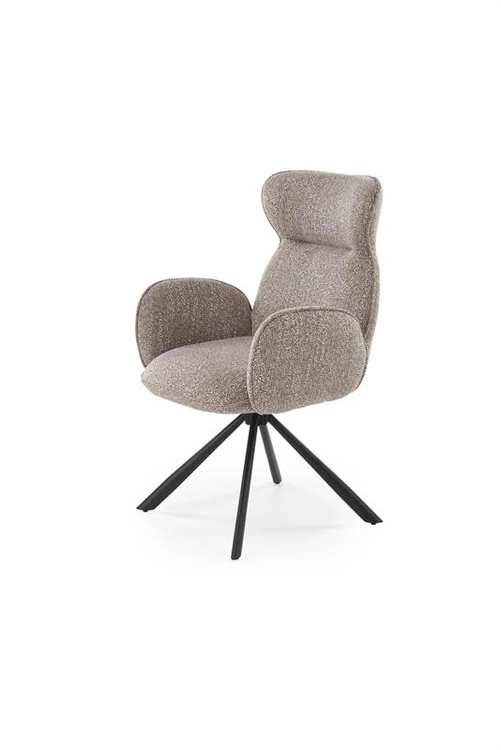 - Krzesło K571 w kolorze ciemny beżowy to elegancki model z funkcją obracania, łączący wygodę i nowoczesny styl. Tapicerowane miękką tkaniną i osadzone na stalowej podstawie, idealne do jadalni, salonu lub biura.