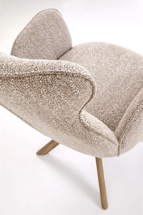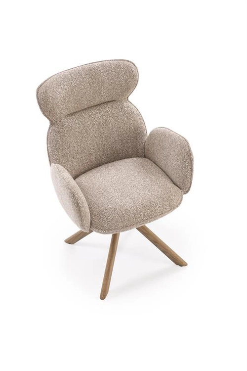 - Krzesło K585 w kolorze ciemnego beżu i jasnego orzecha łączy elegancję z funkcjonalnością. Tapicerowane miękką tkaniną, z obrotowym siedziskiem i dębową konstrukcją, idealne do nowoczesnych jadalni i salonów.