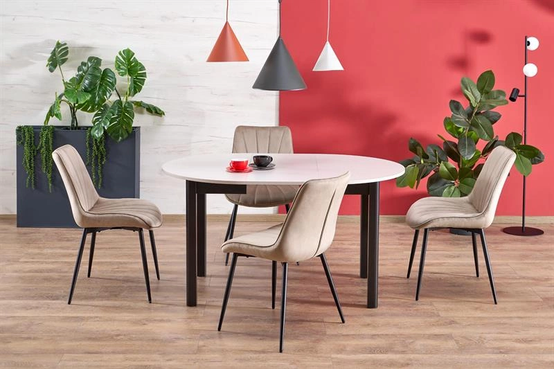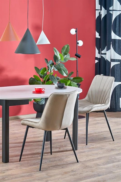 • Krzesło K589 w beżowym kolorze to elegancki i wygodny mebel do jadalni lub salonu. Tapicerowane miękkim welwetem BLUVEL i wsparte na czarnej stalowej podstawie, łączy komfort siedzenia z nowoczesnym stylem.