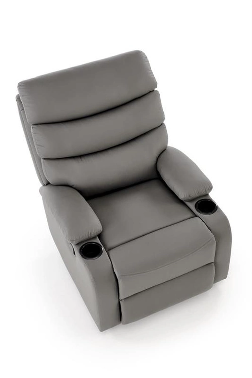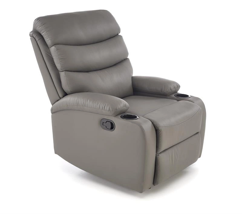 - PERUS to rozkładany fotel wypoczynkowy w kolorze popielatym, wykonany z trwałej eco skóry. Wyposażony w uchwyty na napoje, zapewnia wysoki komfort i praktyczne udogodnienia, idealny do relaksu w domowym zaciszu.