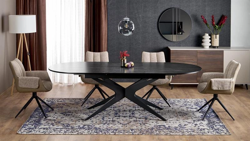 - Stół SANDRO w kolorze czarnym to nowoczesny, rozkładany model o długości 180–240 cm. Wykonany z MDF okleinowanego melaminą i stali malowanej proszkowo, łączy elegancję z trwałością, idealny do przestronnych jadalni.
