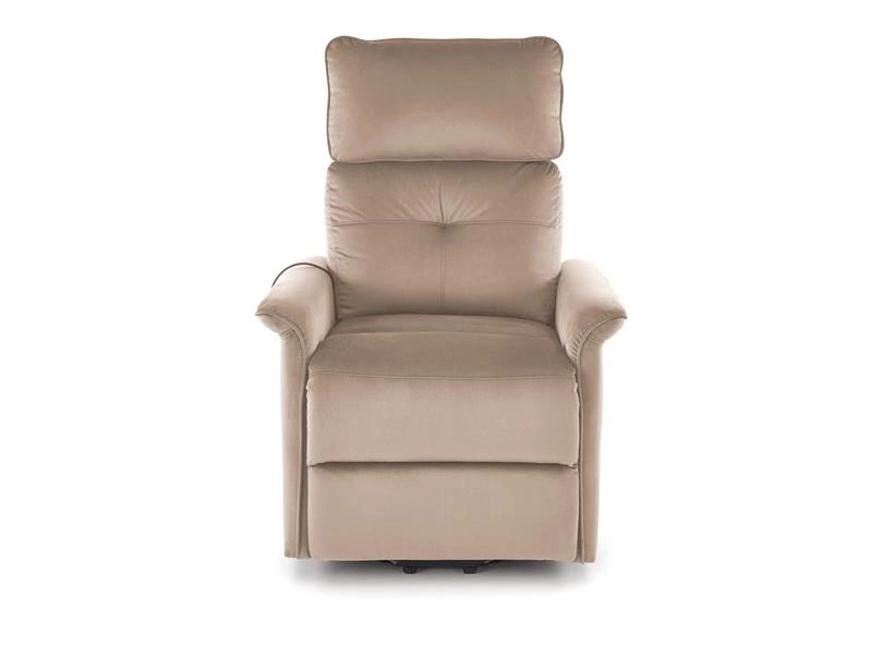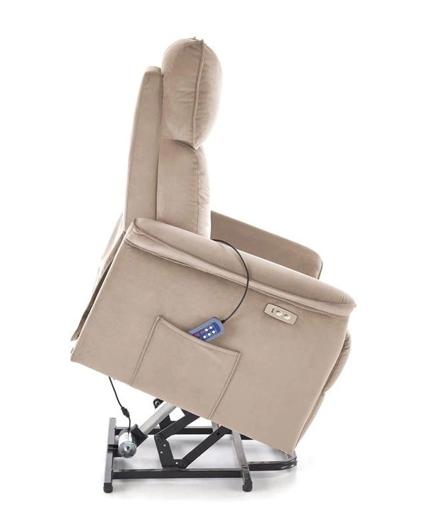 SEMIR 2 to luksusowy fotel wypoczynkowy, który oferuje wyjątkowy komfort i nowoczesne funkcje. Tapicerowany miękką, aksamitną tkaniną velvet BLUVEL w ciepłym, beżowym odcieniu #40, wnosi do wnętrza elegancję i przytulny charakter. Mechanizm elektrycznego rozkładania pozwala na płynną zmianę pozycji siedziska, a funkcja pionizacji ułatwia wstawanie, co czyni go idealnym rozwiązaniem dla osób ceniących wygodę i bezpieczeństwo. Wbudowany system masażu zapewnia odprężenie po długim dniu, a gniazdo USB umożliwia ładowanie urządzeń mobilnych bez wstawania. SEMIR 2 to doskonały wybór do salonu, gabinetu lub strefy relaksu, łączący estetykę z funkcjonalnością.